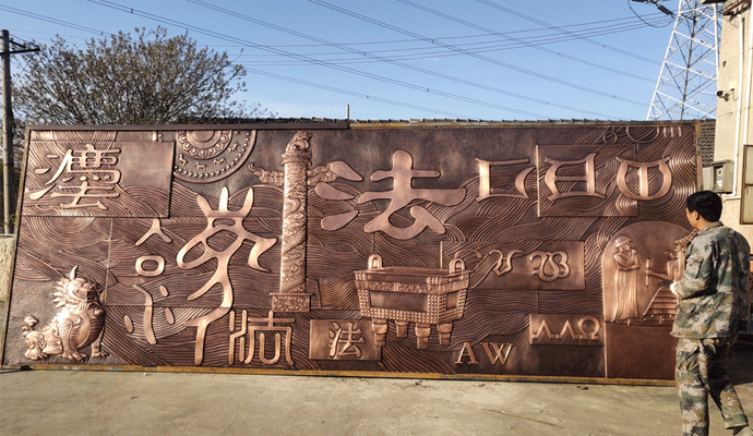 在鍛銅浮雕制作運(yùn)輸現(xiàn)場后,我們會對浮雕運(yùn)輸中的磕碰進(jìn)行修補(bǔ)、找平處理,然后開始測量浮雕安裝位置,找對位置,進(jìn)行浮雕安裝的焊接。整體安裝完成甲方領(lǐng)導(dǎo)同意方可離開。